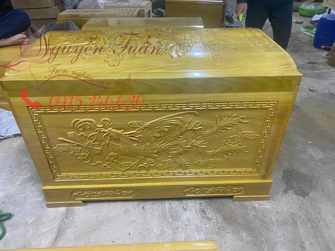 Quách Gỗ Vàng Tâm Hai Thành Chạm Phượng,Lắp Chạm Sen